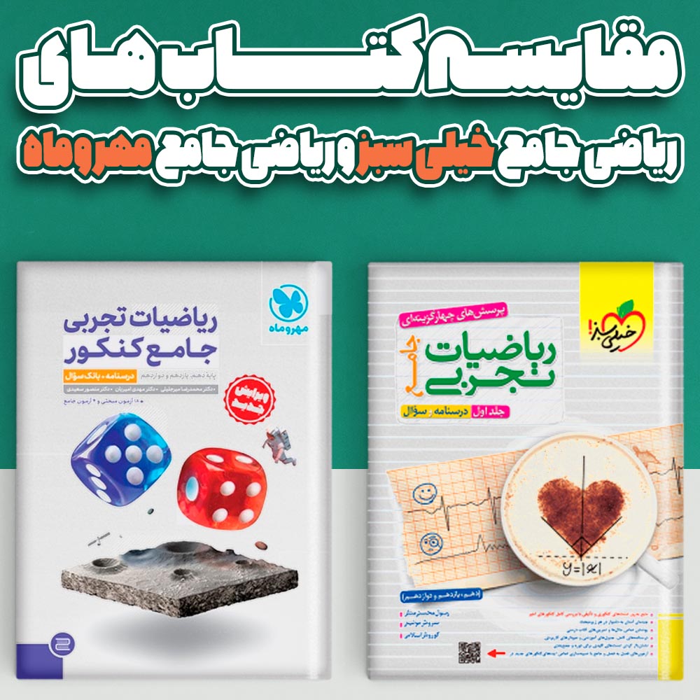 تو این مقاله میخوایم دو تا از بهترین و محبوب ترین کتاب های جامع ریاضی تجربی یعنی ریاضی جامع تجربی خیلی سبز و ریاضیات تجربی جامع کنکور مهروماه رو بررسی و با توجه به قسمت های متنوعی که دارن با هم مقایسه کنیم. اینجوری برای انتخاب کتاب درسی ریاضی با توجه به نیازتون میتونید اقدام کنید و قطعا نتیجه ی بهتری براتون حاصل میشه.
