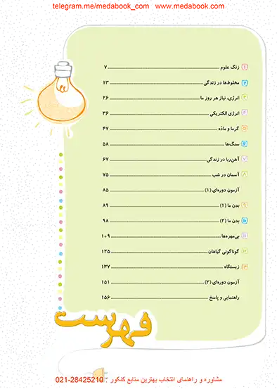 کتاب کار علوم چهارم خیلی سبز شامل مباحثی هست که در عکس فهرست کتاب درج شده و در زیر میبینید: