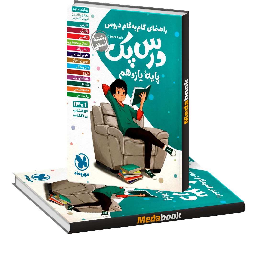 درس پک گام به گام دروس یازدهم انسانی مهر و ماه مانند مدرسه همراه دانش آموزان است تا تمام دروس مقطع یازدهم کتاب انسانی را در یک کتاب برای دانش آموزان ارائه دهد.این کتاب در رنگ های مختلفی نگارش شده تا کاربران از مطالب خسته نشوند علاوه بر این در کناره های کتاب یک بخشی از درس را اشغال کرده است که رنگ های مختلفی دارد تا شما دانش آموزان هر درس را به صورت مجزا و راحت پیدا کنید.از مزیت های این کتاب دارای سه ایستگاه است 1)ایستگاه آموزش : آموزش مفاهیم و نکات درس به صورت مختصر و نموداری و… و ارائه قالب های نکته و تذکرات مفید.2) ایستگاه سنجش: دارای پاسخ های کامل تمام سوالات و تمرین ها و فعالیت های کلاس درس به ترتیب کتاب درسی در جهت سنجش دانش آموزان.3)ایستگاه درس: تا مطالب کتاب درسی کامل و یکجا در ذهن دانش آموز ثبت شود.درس پک گام به گام دروس یازدهم انسانی از مجموعه درس پک مهروماه میباشد.